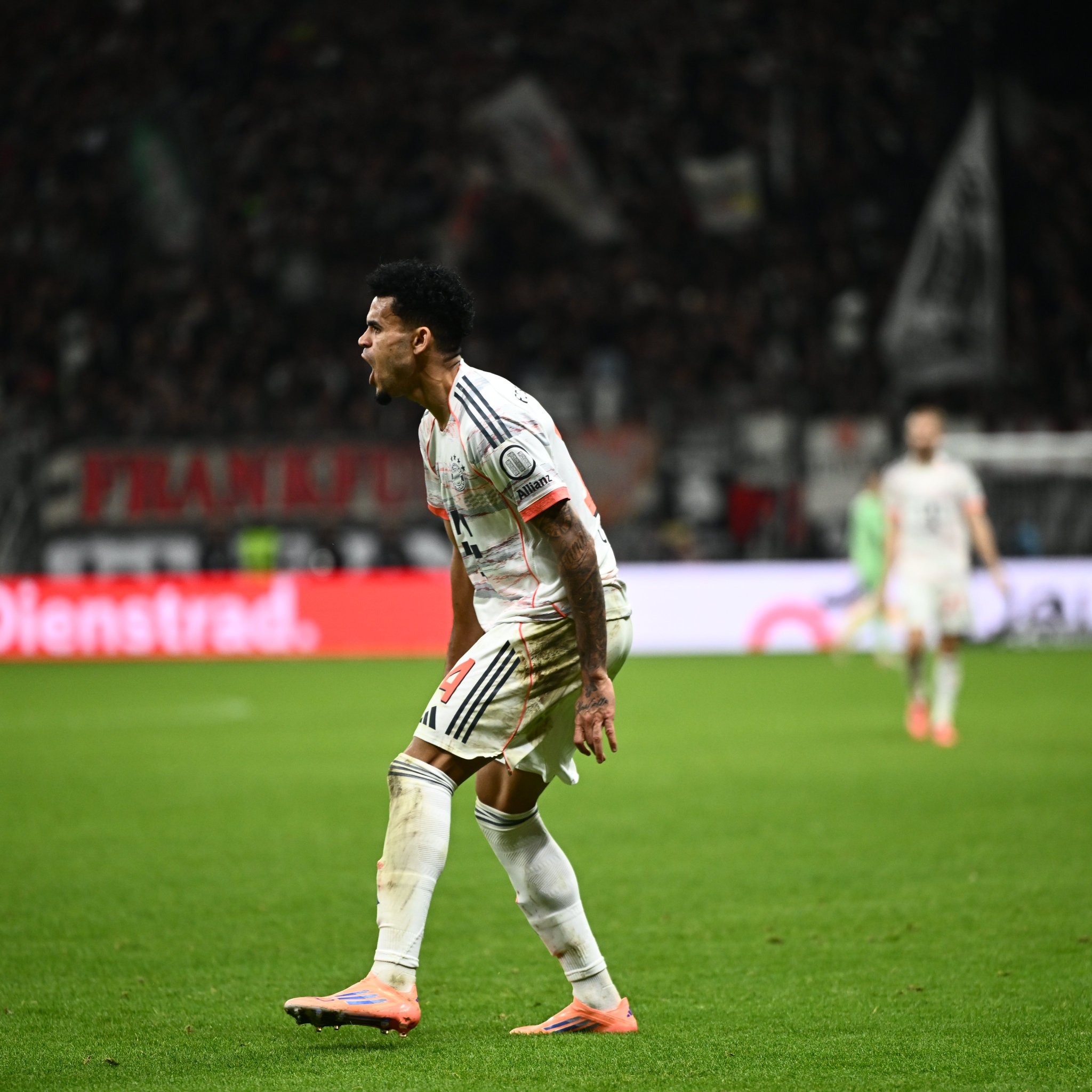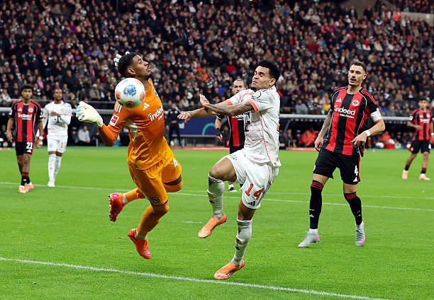 แฟรงเฟิร์ตดันสูงแต่ฮอยลุนด์พลาดลื่นล้ม ถูกบาเยิร์นโต้กลับ บอลมันไปจบที่ ดิอาส ซัดมุมแคบเช็คเสาเข้าประตูไปเลย อย่างโหด 3-0