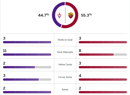 มอยส์ คีน ยิงให้ ฟิออเรนติน่า นำ 14 นาทีแรก แต่ไม่นาน มาติอัส ซูเล่ ปั่นโค้งตีเสมอ แล้วก่อนจบครึ่งแรก เปิดเตะมุมให้ ไบรอัน คริสตันเต้ โขกแซง ช่วงเวลาที่เหลือ โรม่า รักษาสกอร์บุกชนะ 2-1 แก้ตัวความพ่ายแพ้บอลยุโรป ขึ้นจ่าฝูง เซเรีย อา ก่อน เอซี มิลาน กับ นาโปลี ลงแข่ง