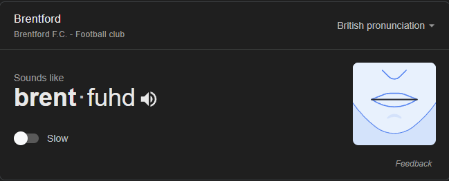 เช่นตามคลิปนี้ หรือไม่ก็ลองเข้า Google Translate พิมพ์ Brentford แล้วให้ออกเสียงแบบ British Pronunciation ก็ได้ครับ
