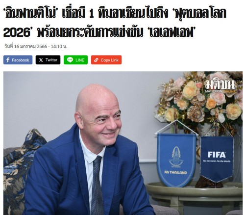 ใครบางคนที่นิวยอร์ค? "บิ๊กปล้ำ" ปราโบโว่ ประธานาธิปดี อินโดนีเซียดอดเข้าพบ อิฟาติโน ประธาน fifa ที่นิวยอร์ค เมื่อช่วงอาทิตย์ก่อน โดยอิฟาติโน่เคยทำนายไว้เมื่อ 2 ปีก่อน ว่าจะมีชาติอาเชี่ยน เข้าร่วมบอลโลก 2026 ของ คำทำนายของอิฟาติโน่จะแม่นหรือไม่ 8 และ 11 ตุลานี้ รู้กัน!!