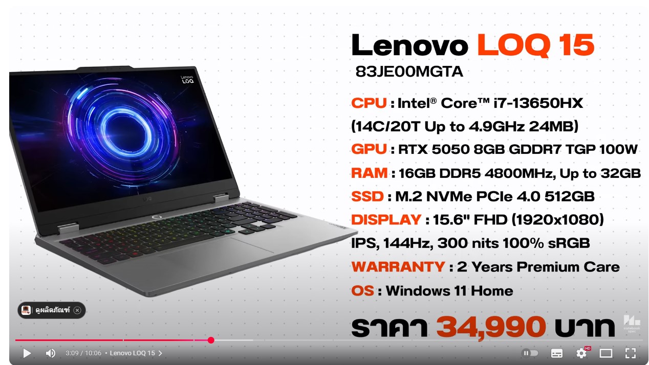 Lenovo ก็จะคล้ายๆ Asus แต่สเปคจะแย่กว่าหน่อยนึงเพราะ LOQ ได้แค่ 5050 ในงบ 40k (ยกเว้นไปสั่งจากเว็บ Lenovo โดยตรง อาจจะได้ 5060 ในสเปคคุ้มกว่า แค่รอนาน) ส่วน Legion5 ก็จะได้ 5050 + Ryzen 7 260 (เหมือนตัวท็อป TUF)