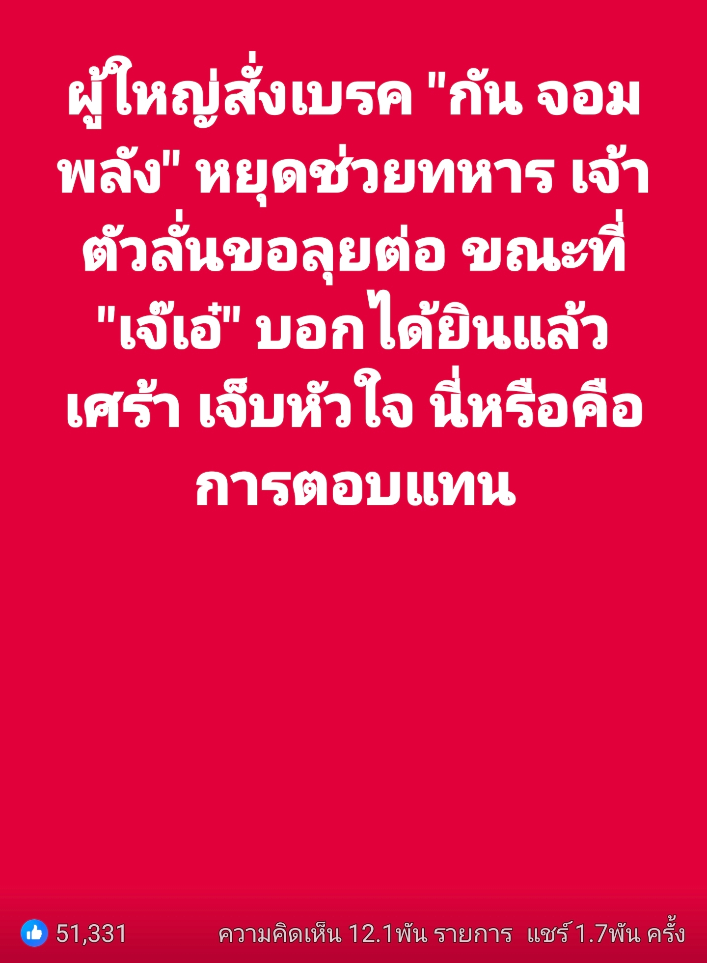 ผู้ใหญ่สั่งเบรค "กัน จอมพลัง" หยุดช่วยทหาร เจ๊เอ๋ ได้ยินแล้ว นี่หรือคือการตอบแทน