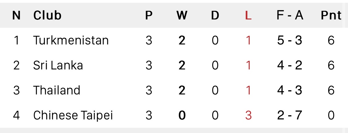 เสกสรรค์ ราตรี กับ ชนาธิป สรงกระสินธ์ ทำคนละ 1 ประตูในครึ่งหลังช่วยให้ “ช้างศึก” ทีมชาติไทย เอาชนะ ไต้หวัน 2-0 ส่วนผลอีกคู่ในกลุ่มเดียวกันเข้าทางไทยเมื่อ ศรีลังกา ชนะ เติร์กเมนิสถาน 1-0