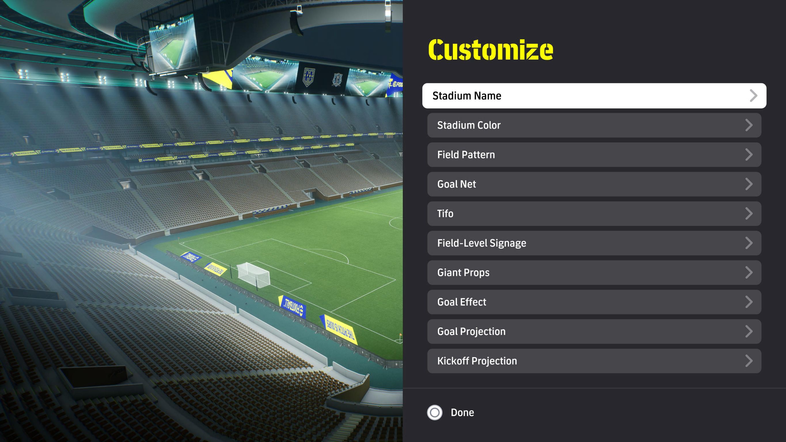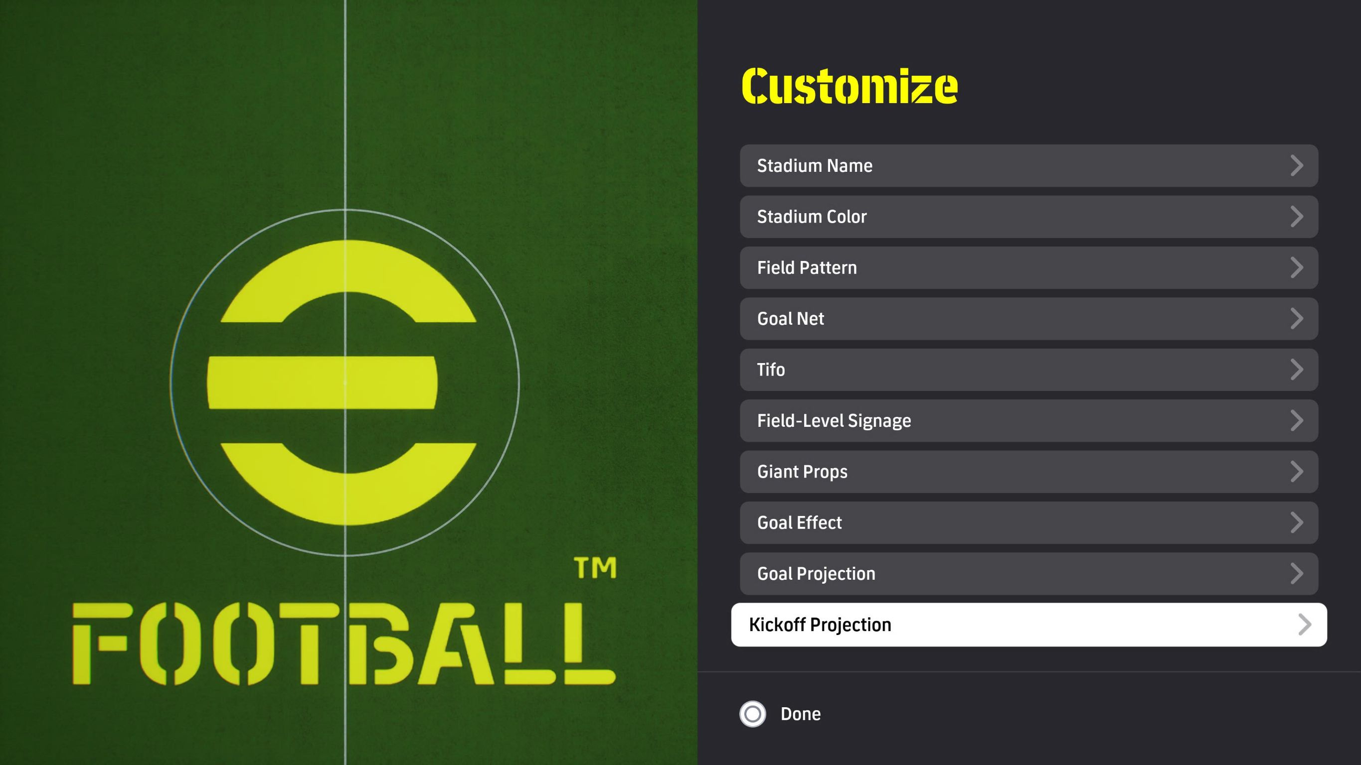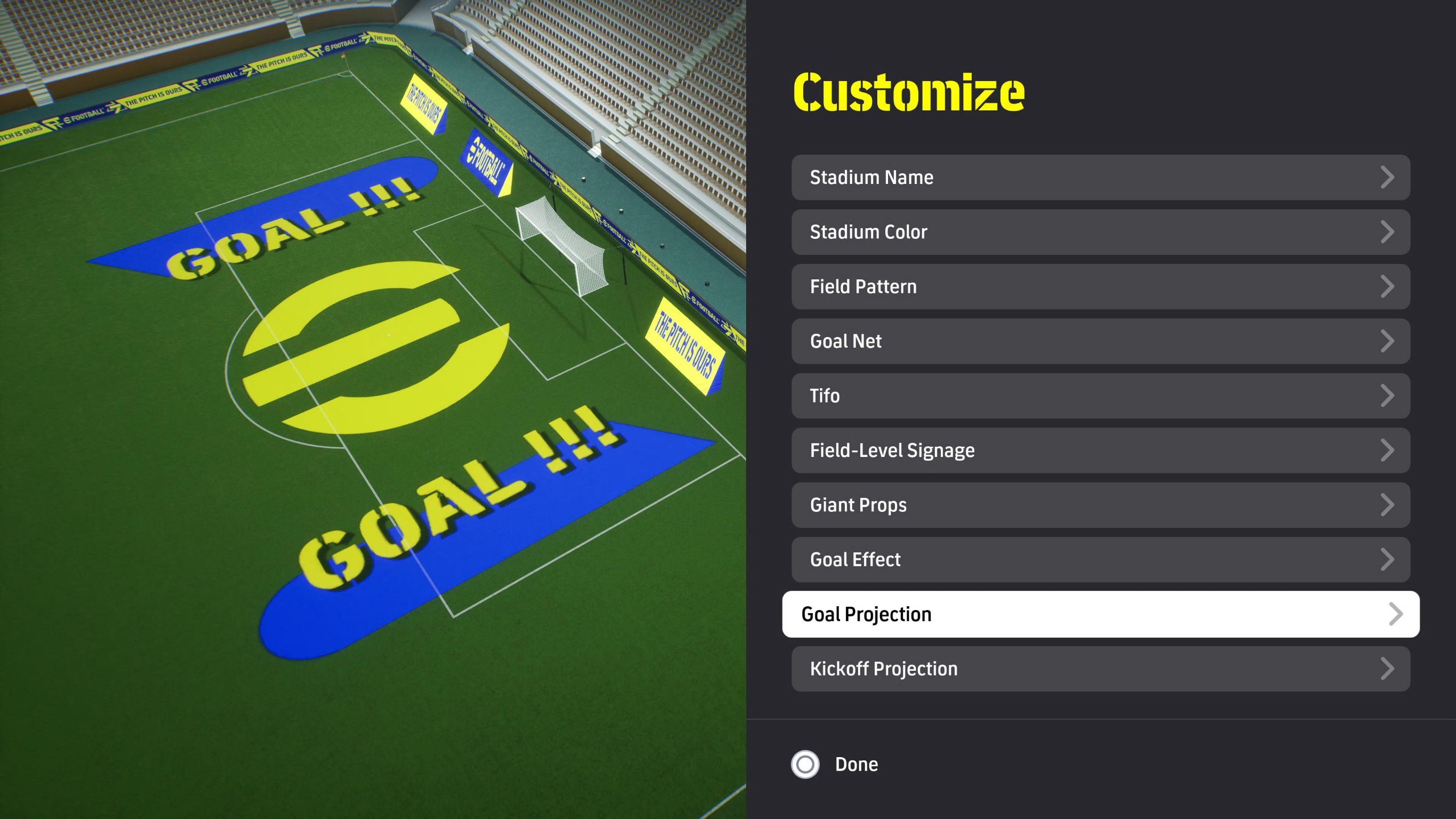 เพิ่ม Goal Projection และ Kick-off Projection เป็นองค์ประกอบสนามกีฬาประเภทใหม่ที่สามารถใช้ได้ในเมนู Custom Stadium