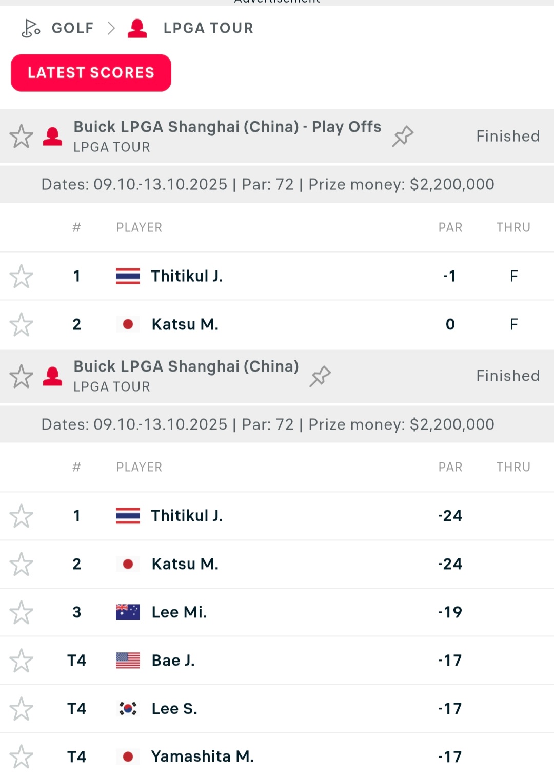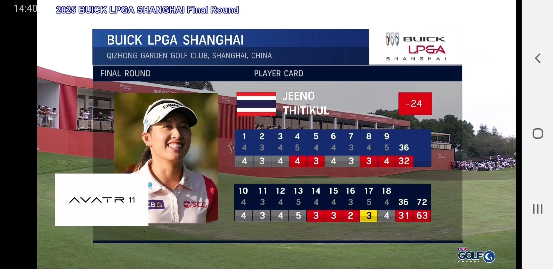 โดยเฉือนชนะเพล์ออฟหลุม 5 Katsu จากญี่ปุ่น หลังจากตามมาตลอด โดยมาตามตีเสมอพัตอีเกิ้ลลงที่หลุม 17 และแข่งเพล์ออฟอีก 5 หลุม เพล์ออฟหลุม 3 น้องจีนตีตกน้ำไปนึกว่าจะแพ้แล้วก็ยังเสมอได้อีกจนมาพลิกชนะที่เพล์ออฟหลุม 5