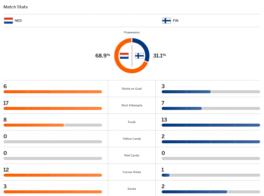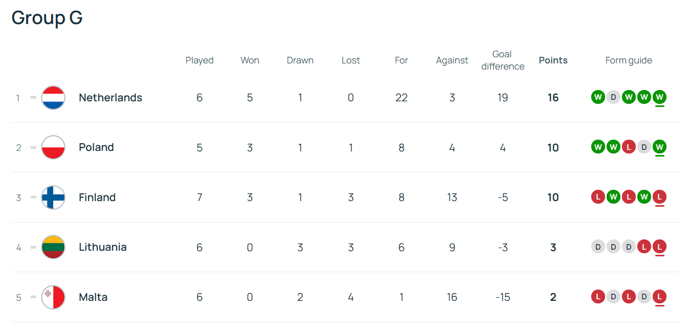 จบเกม เนเธอร์แลนด์ เอาชนะ ฟินแลนด์ ไปได้ 4-0 ทำให้พวกเขามีเพิ่มเป็น 16 แต้มจากการลงเล่น 6 นัดและถ้าผลคู่อื่นเป็นใจนัดหน้าพวกเขาอาจตีตั๋วไปเล่นบอลโลก