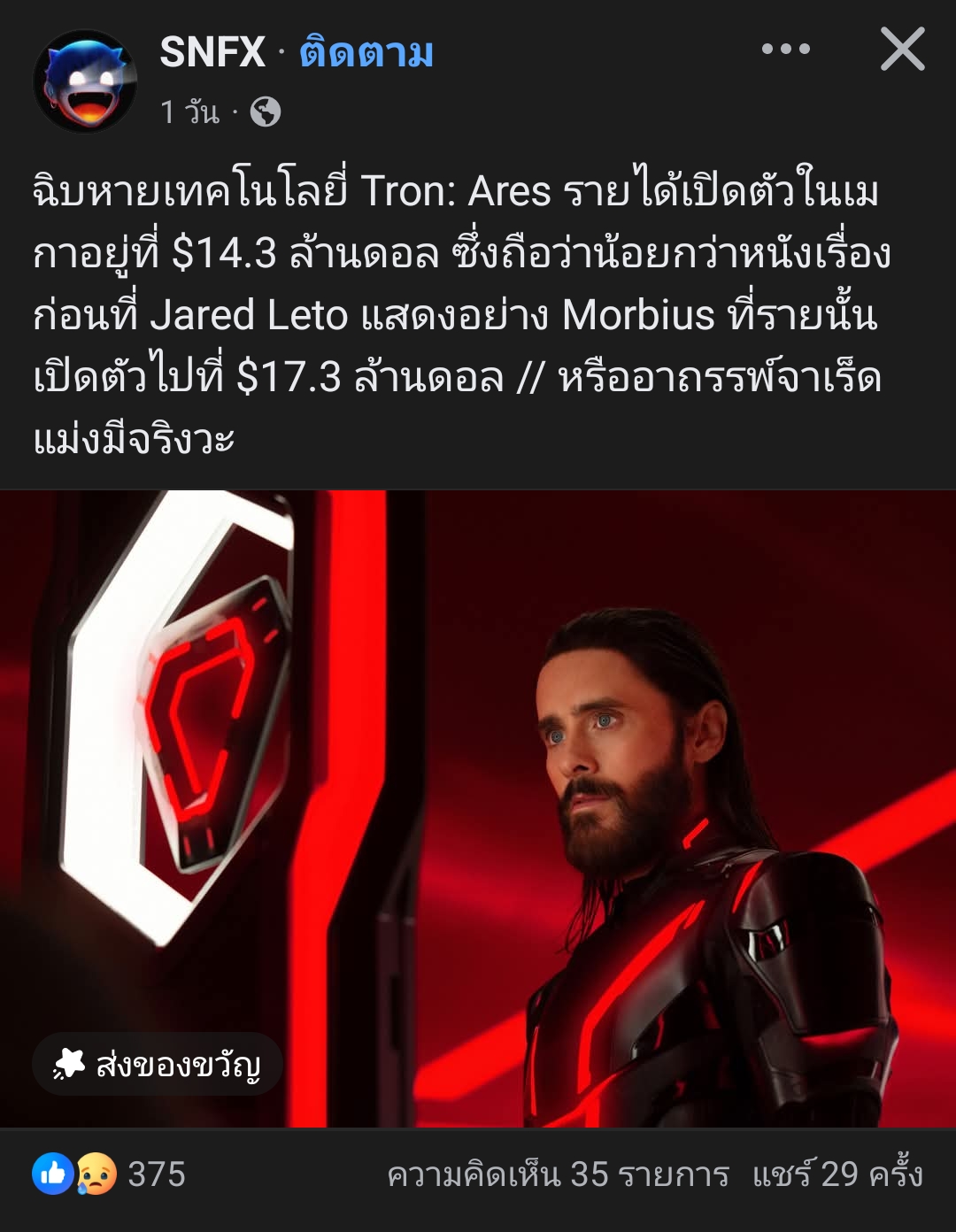 [RE: Tron: Ares รายได้เปิดตัวในอเมริกา 14.3 ล้านดอล น้อยกว่าเรื่อง Morbius]