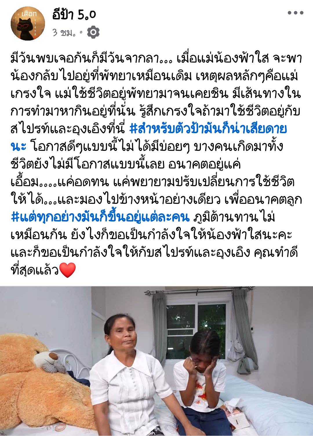 จนวันนี้ คุณแม่ขอพาน้องกลับ พัทยา อาจจะด้วยความไม่คุ้นชิน หรือปัจจัยอะไรก็ตามแต่ ตอนนี้กระแสในเน็ต หลายคนโจมตีคุณแม่กันว่า ทำไม ไม่ทนอีกนิดเพื่อลูก ลูกกำลังไปได้ไกล ทำไมทิ้งโอกาสนี้ บลาบลาบลา ในมุมท่าน คิดยังไงกันครับ