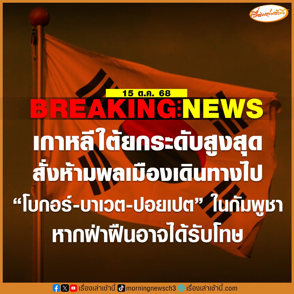 ด่วน! เกาหลีใต้ประกาศยกระดับสูงสุด สั่งห้ามพลเมืองเดินทางไป “โบกอร์-บาเวต-ปอยเปต” ในกัมพูชา หากฝ่าฝืนอาจได้รับโทษ มีผลพรุ่งนี้