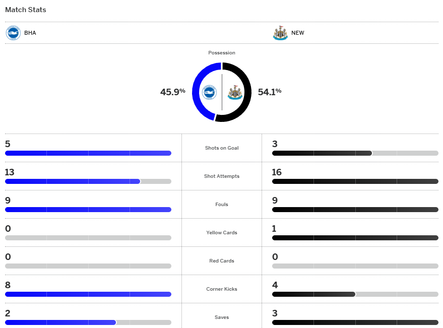 จบเกม นิวคาสเซิ่ล แพ้ไป 2-1 ไร้ชัยชนะเป็นเกมที่ 6 ติดต่อกันในการเจอกับ ไบรท์ตัน รวมถึงยังรั้งอันดับ 12 ของตารางมีเพียงแค่ 9 แต้มจาก 8 เกม