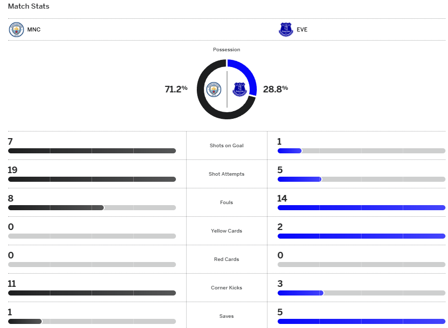 เอฟเวอร์ตันไปเสียบอลกลางสนามแล้วโดนสวนกลับฮาลันด์พาบอลมาก่อนไหลให้ไรจ์นเดอร์สดีดต่อโดกูเอียงตัวยิงทันทีแต่พิคฟอร์ดออกมาบล็อคบอลได้ก่อน