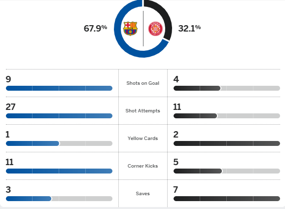 เปดรี ผลิตสกอร์นำนาทีที่ 13 แล้วไม่นานเจอลูกจักรยานอากาศ อักเซล วิตเซล ตีเสมอ จากนั้น บาร์เซโลน่า บวกเพิ่มไม่ได้ทำท่าจะไร้ชัย 3 เกมติดทุกรายการ แถม ฮันซี่ ฟลิค โวยเปารับแดง แต่ทดเจ็บ 90+3 โรนัลด์ อเราโฮ่ ซูเปอร์ซับยิงตัดสิน เปิดรังเฉือน กิโรน่า 2-1 นำฝูง 1 แต้มก่อน เรอัล มาดริด แข่งพรุ่งนี้