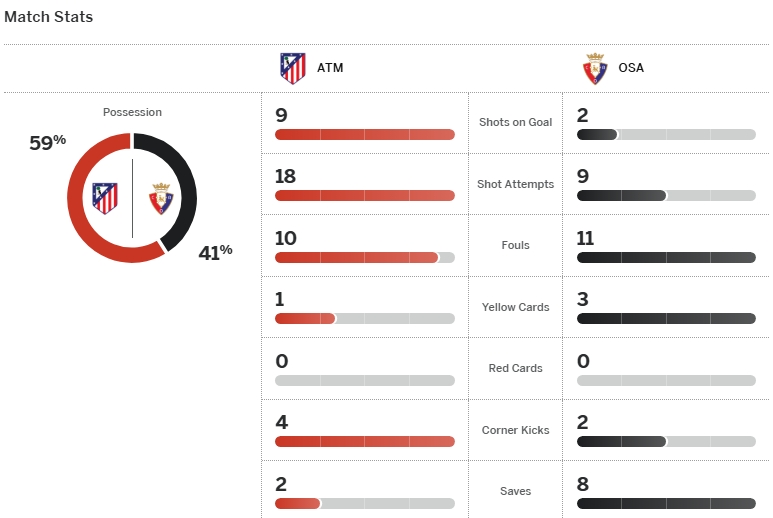 จบเกม แอตเลติโก้ มาดริด เปิดบ้านเฉือน โอซาซูน่า 1-0 เก็บเพิ่มเป็น 16 คะแนนจาก 9 เกม ขึ้นมาอยู่อันดับ 4