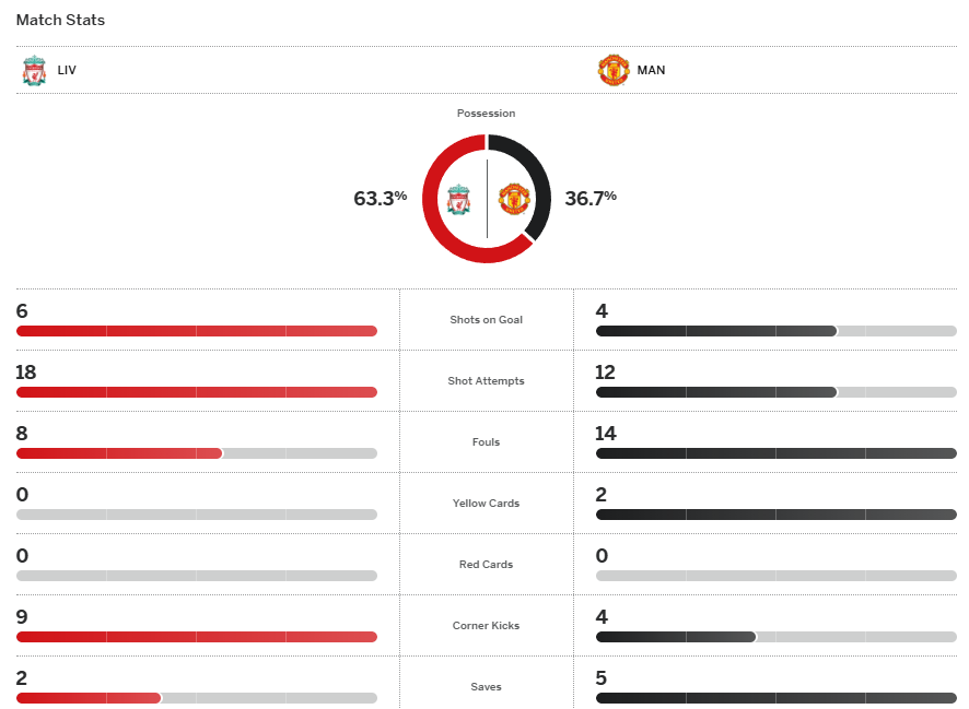 ไบรอัน เอ็มเบอโม่ ยิงขึ้นนำตั้งแต่ 2 นาทีแรก แต่ลิเวอร์พูล พยายามบุกก่อนมาไล่ตีเสมอจากโคดี้ กัคโป แต่กลับกลายเป็นแฮร์รี่ แม็คไกวร์ โขกตุงตาข่ายนาทีที่ 84 เป็นประตูชัยให้แมนเชสเตอร์ ยูไนเต็ด บุกชนะ 2-1 ทำให้ทีมของอาร์เน่อ สล็อท พ่าย 4 นัดติดหาทางกลับฝั่งไม่เจอ