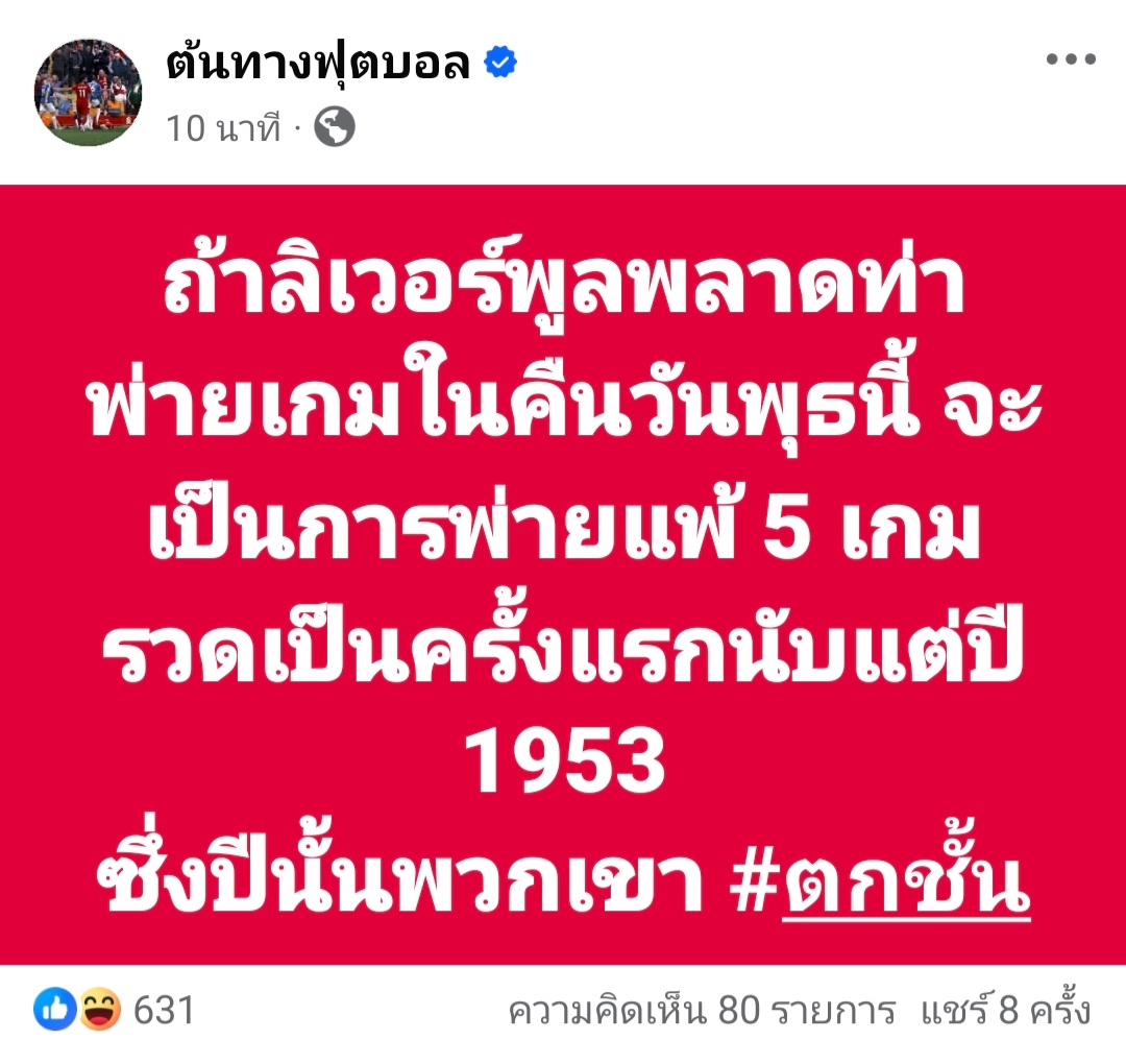 ถ้าขนาดนั้นคงโดนปลดแบบรานิเอรีตอนเลสเตอร์หลังปีได้แชมป์ แถมหงส์ลงเงินมากกว่ามหาศาลด้วย 400 กว่าล้านยูโร