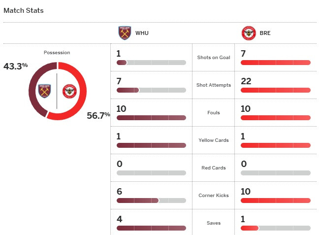 เกมช่วงแรก เวสต์แฮม ทำได้ดีกว่าจากลูกเตะมุมหลายหน ก่อนที่เบรนท์ฟอร์ด จะกลับสู่เกมเป็นฝ่ายที่ครองบอลและได้ลุ้นทำประตูมากกว่า