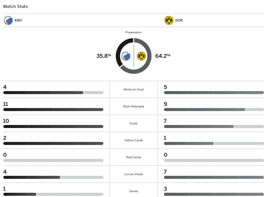 จบเกม ดอร์ทมุนด์ เอาชนะ โคเปนเฮเก้น 4-2 เก็บไปแล้ว 7 แต้มจาก 3 นัดแรกทำให้พวกเขาอยู่ในอันดับ 4 เวลานี้