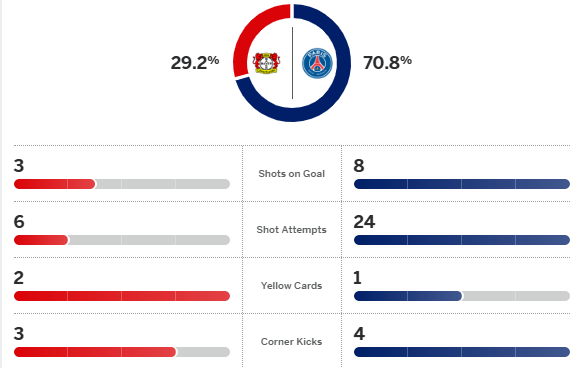 ปารีส แซงต์-แชร์กแมง นำต้นเกมโดนตีเสมอ แล้วท้ายครึ่งแรกเกิดจุดเปลี่ยน สองฝั่งรับใบแดงต่างเหลือ 10 คน จากนั้นทีมแชมป์เก่ารัวยิงโดย เดซิเร่ ดูเอ้ ผลิตสองสกอร์ ส่วน ควิช่า ควารัตส์เคเลีย, นูโน่ เมนเดส, อุสมาน เด็มเบเล่ และ วิตินญ่า คนละหนึ่ง บุกถล่ม เลเวอร์คูเซ่น 7-2 เก็บ 9 แต้มเต็ม นำจ่าฝูง แชมป์เปี้ยนส์ ลีก