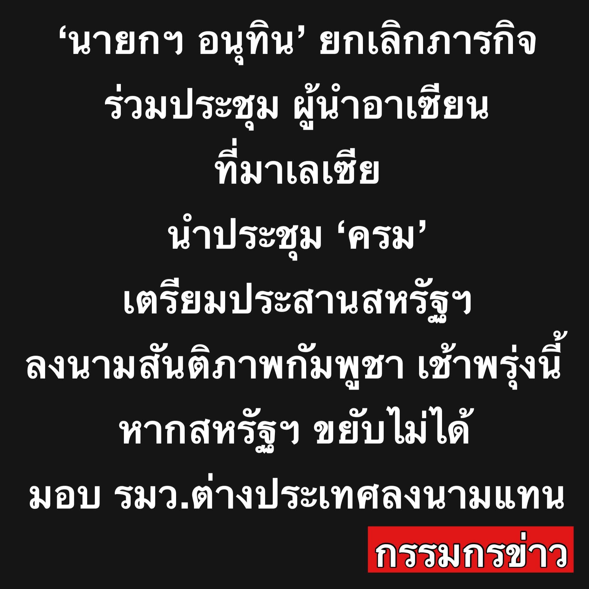 ‘นายกฯ อนุทิน’ ยกเลิกภารกิจ ร่วมประชุมสุดยอดผู้นำอาเซียน ที่มาเลเซีย นำประชุม ครม. เตรียมประสานสหรัฐฯ ลงนามสันติภาพกัมพูชาเช้าพรุ่งนี้ หากสหรัฐฯ ขยับไม่ได้ มอบรัฐมนตรีต่างประเทศลงนามแทน