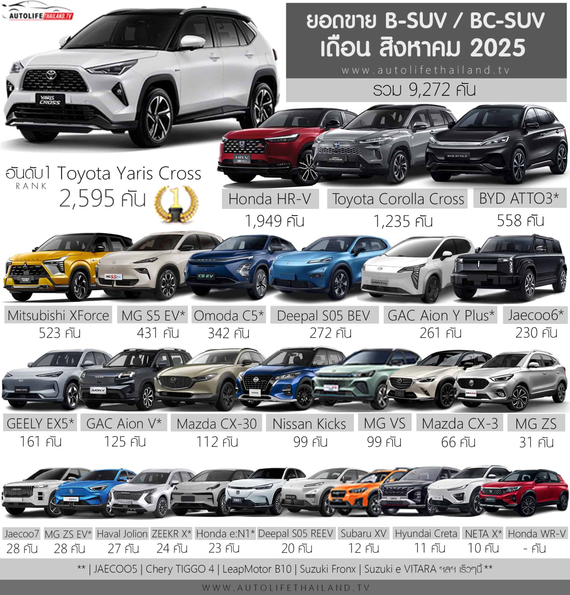 ::ยอดขาย สันดาป + ไฟฟ้า100% ในกลุ่ม B-SUV / BC-SUV เดือน สิงหาคม 2025 รวม 9,272 คัน :