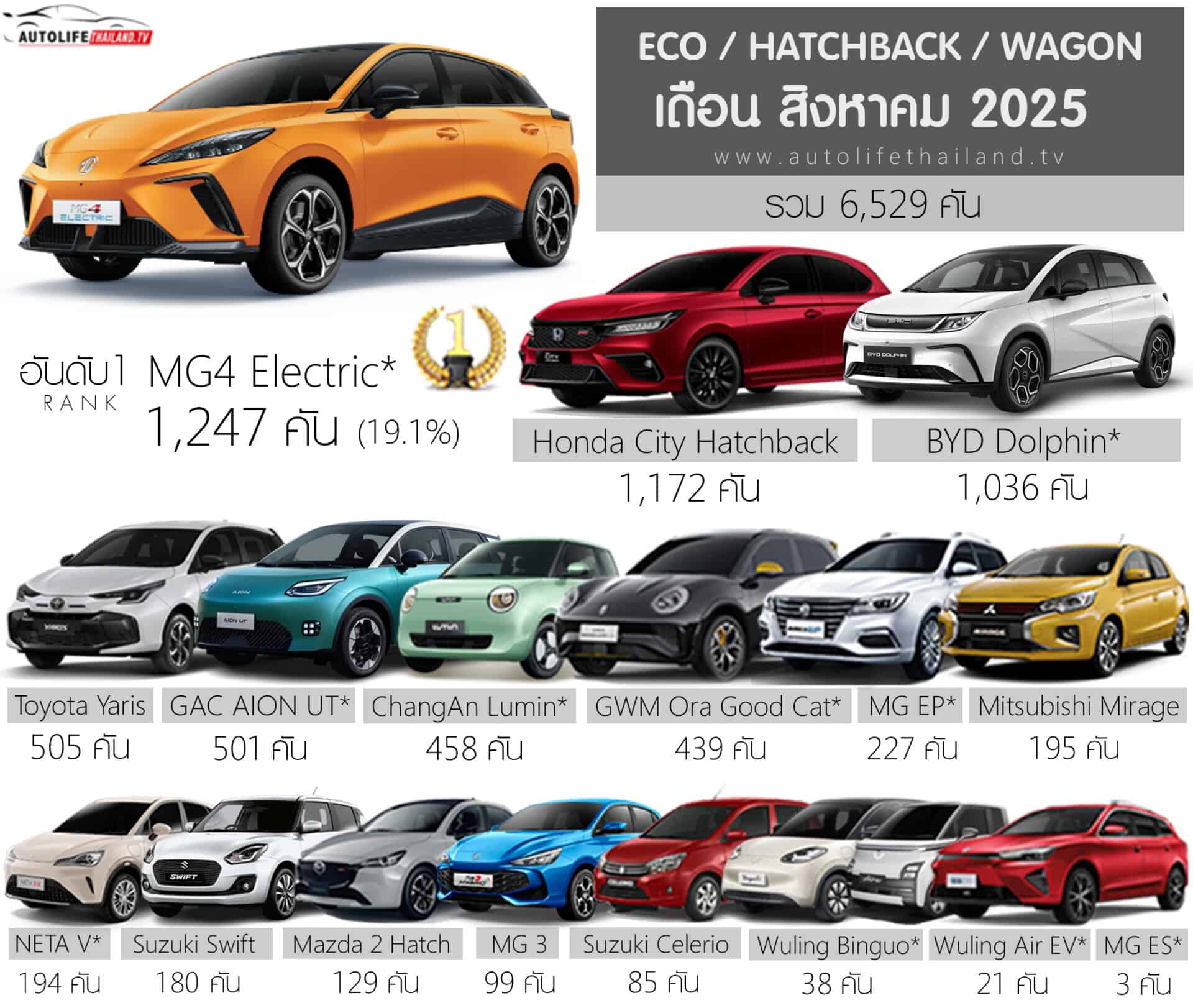 ::ยอดขาย สันดาป + ไฟฟ้า100% ในกลุ่ม ECO / B-Segment Hatchback เดือน สิงหาคม 2025 รวม 6,529 คัน :