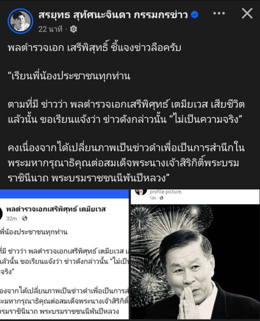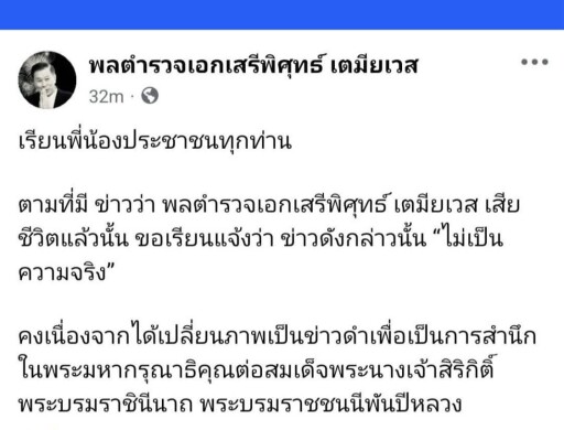 ตามที่มี ข่าวว่า พลตำรวจเอกเสรีพิศุทธ์ เตมียเวส เสียชีวิตแล้วนั้น ขอเรียนแจ้งว่า ข่าวดังกล่าวนั้น “ไม่เป็นความจริง”