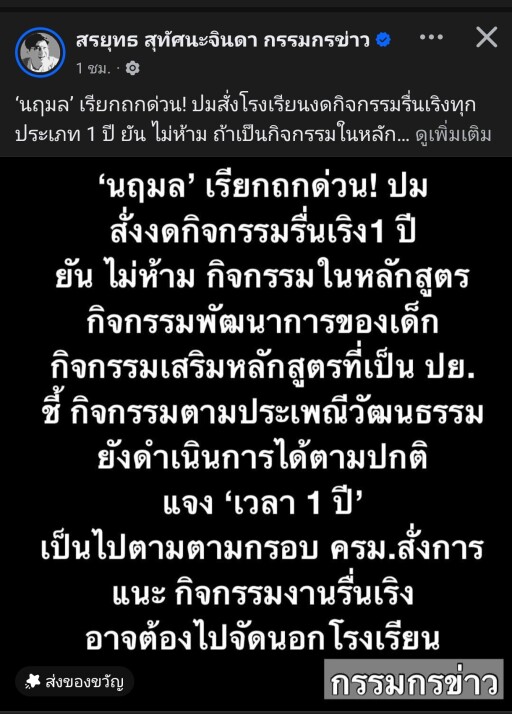 ‘นฤมล’ เรียกถกด่วน! ปมสั่งโรงเรียนงดกิจกรรมรื่นเริงทุกประเภท 1 ปี ยัน ไม่ห้าม ถ้าเป็นกิจกรรมในหลักสูตร-เกี่ยวกับพัฒนาการของเด็ก-กิจกรรมเสริมหลักสูตรที่เป็นประโยชน์กับนักเรียน ชี้ กิจกรรมตามประเพณีวัฒนธรรม ยังดำเนินกิจกรรมได้ตามปกติ แจง ‘เวลา 1 ปี’ เป็นไปตามตามกรอบ ครม.สั่งการหน่วยงานราชการทุกแห่ง แนะ กิจกรรมงานรื่นเริง ต้องไปจัดนอกโรงเรียน