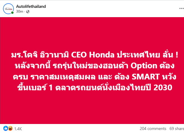 [RE: "CEO Honda ลั่น! รถใหม่ต้องครบ คุ้ม SMART – เล็งแซงขึ้นเบอร์ 1 ปี 2030!"]
