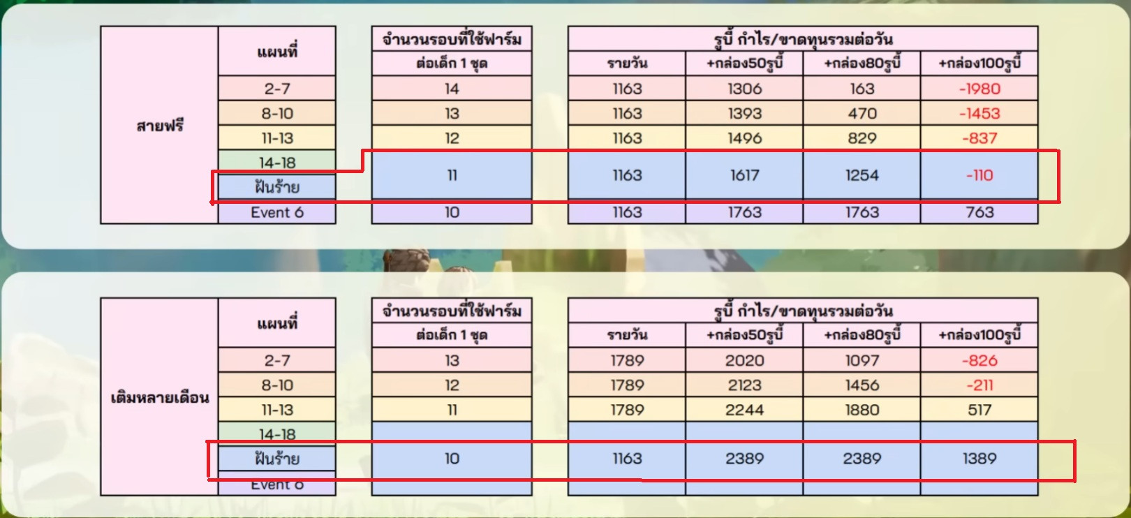 จากตารางในรูปด้านบน จะเห็นว่า สายฟรีไม่เติมรายเดือน ถ้าไม่ใช่ช่วงกิจกรรมที่มีแมป a6 ให้ฟาร์ม
