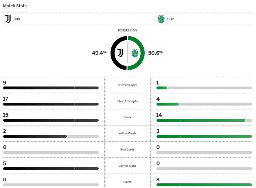 ยูเวนตุส พลาดเสียประตูนำตั้งแต่ช่วงต้นเกมแต่ก็ยังได้ ดูซาน วลาโฮวิช ยิงคืนมาได้ กระนั้นช่วงเวลาที่เหลือ ม้าลาย หาประตูเพิ่มไม่ได้เลยเสมอกับ สปอร์ติ้ง ลิสบอน 1-1 ทำให้พวกเขายังไม่มีชัยชนะเลยหลังเสมอ 3 แพ้ 1 จาก 4 เกมในแชมเปี้ยนส์ลีกซีซั่นนี้