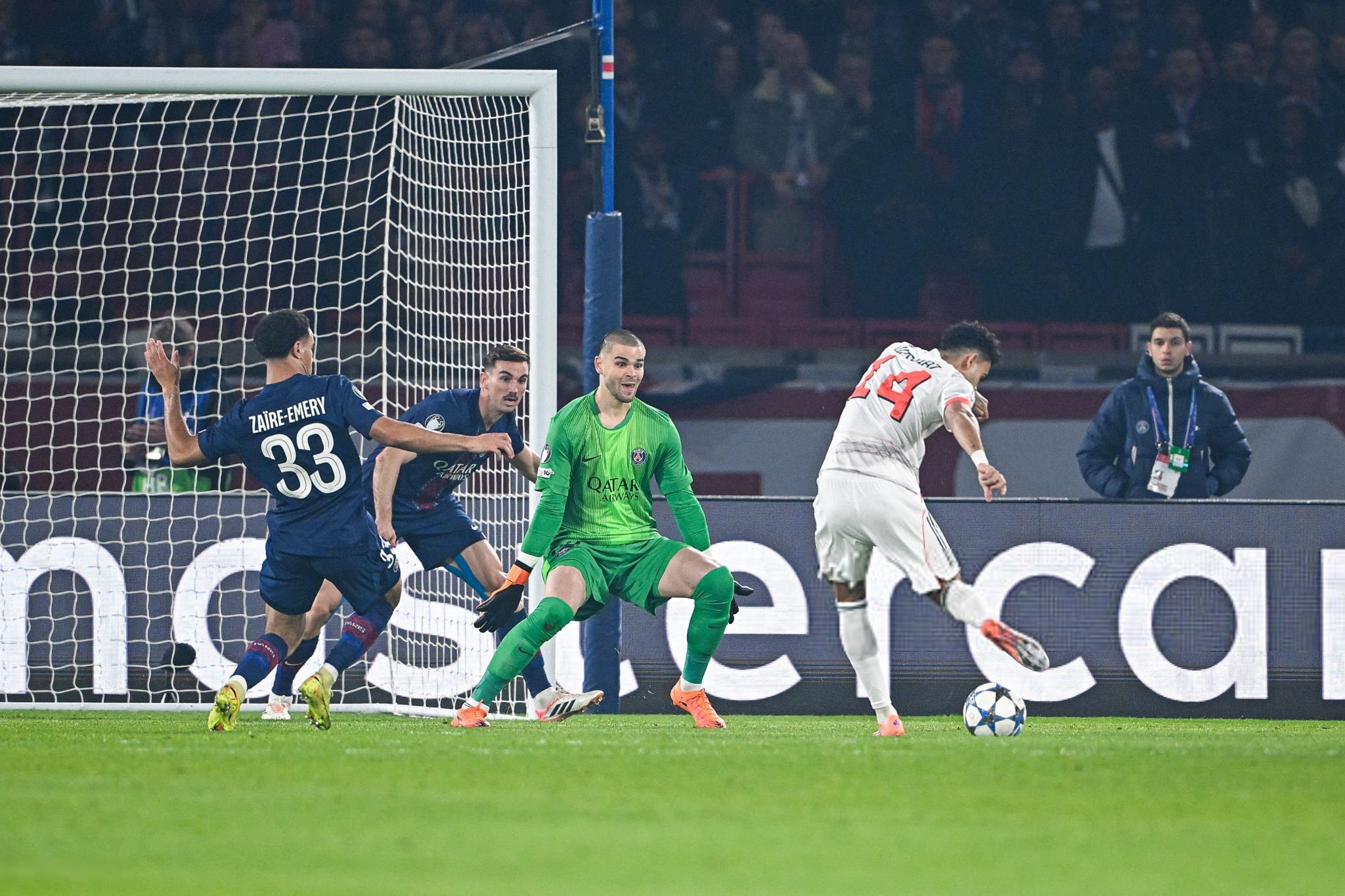 P$G บุกไปกดดัน บาเยิร์น ได้บ่อย แต่พวกเขาขาดความเฉียบคม จังวะนี้ รุยซ์ รับบอลจาก ฮาคิมี่ ก่อนเลือกยิงไกลแต่ข้ามคานไปเยอะ