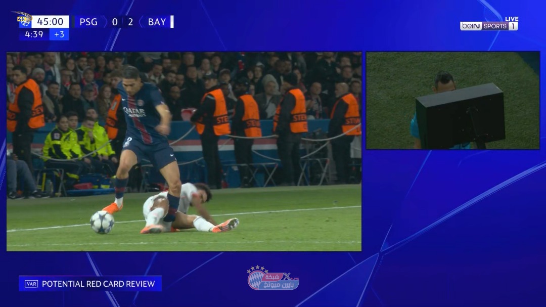 บาเยิร์น ต้องมาเหลือผู้เล่นเพียง 10 คนก่อนจบครึ่งแรก จังหวะที่ ดิอาซ เข้าสไลด์ด้านหลังของ ฮาคิมี่ จากตอนแรกเป็นใบเหลือง แต่ผู้ตัดสินไปเช็ค VAR ก่อนอัพเกรดเป็นใบแดง ขณะที่ P$G เปลี่ยนตัว ฮาคิมี่ ที่เจ็บจากจังหวะดังกล่าว