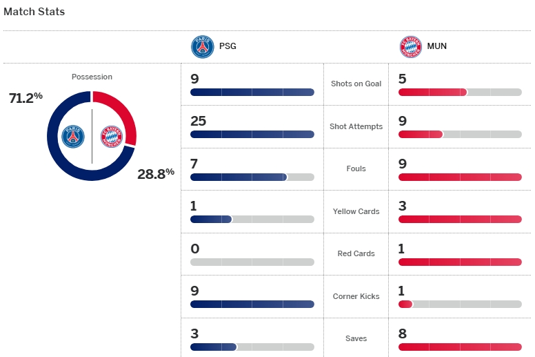 บาเยิร์น มิวนิค เกมรุกใช้โอกาสไม่เปลืองเลย จนมาได้สองประตูขึ้นนำจาก หลุยซ์ ดิอาซ เบิ้ลคนเดียว แต่ช่วงทดเจ็บของครึ่งแรกแนวรุกโคลอมเบียมาโดนไล่ออกจากจังหวะทำฟาวล์ อัชราฟ ฮาคิมี่ จนรายหลังเจ็บ โดยก่อนหน้านั้น อุสมาน เด็มเบเล่ เล่นต่อไม่ไหวจนเดี้ยงออกเช่นกัน ด้วยตัวผู้เล่นที่มากกว่า ปารีส แซงต์-แชร์กแมง บุกหนักจนได้ประตูตีไข่แตกจาก เจา เนเวส แต่ก็ไล่ไม่ทัน จบเกม บาเยิร์น บุกชนะด้วยสกอร์ 2-1