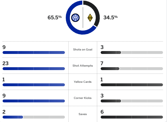 ดุมฟรีส์ เก็บบอลที่ฝั่งซ้ายเขตโทษเปิดเข้ากลาง เอสโปซิโต้ โขกติดบล็อคเข้าทาง เลาตาโร่ ซ้ำในกรอบ 6 หลาติดบล็อคอีก แต่ยังกลับมาเข้าทางให้ยิงดาบสามไม่พลาด งูใหญ่ 1-0