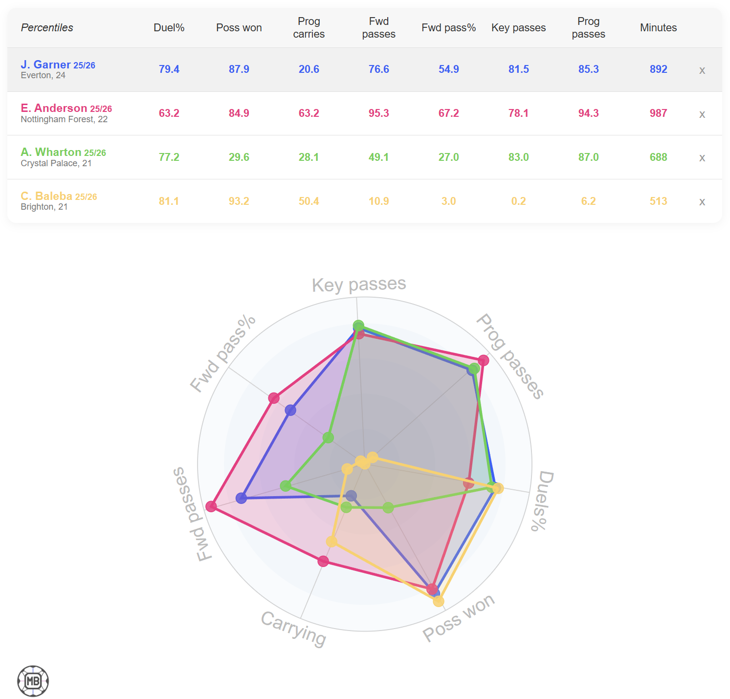 มาฤดูกาลนี้เห็นทวิตนึงยกสถิติจากเว็บนึงมา ผมเลยลองเข้าเว็บดังกล่าวแล้วเพิ่มตัวเปรียบเทียบกับกองกลางที่กำลังเป็นข่าวว่าได้รับความสนใจจากหลายๆทีมดู ภาพมันก็ออกมาประมาณนี้