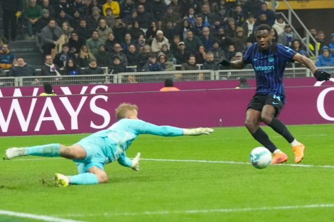 อินเตอร์ เก็บบอลได้มากกว่าคราวนี้เป็น ดุมฟรีส์ หลุดเข้าเขตโทษไหลย้อนให้ อคันยี่ เติมยิงไม่จับข้ามคาน