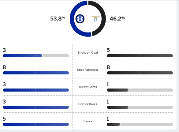 เลาตาโร่ มาร์ติเนซ ยิงเหนือชั้นด้วยลูกติดไซด์ก้อยขึ้นนำตั้งแต่นาทีที่ 3 จากนั้นกลางครึ่งหลัง อองเช่-โยอัน บอนนี่ คู่หูกองหน้าชาร์จจ่อเพื่อปิดกล่อง อินเตอร์ มิลาน เปิดบ้านชนะ ลาซิโอ 2-0 คว้าชัย 4 เกมติดทุกรายการ เบรกทีมชาติด้วยการนำจ่าฝูง เซเรีย อา แบบแต้มเท่ากันกับ โรม่า