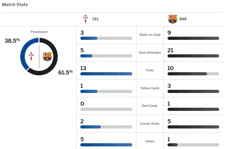 บาร์เซโลน่า ไม่พลาดคว้า 3 แต้มกลับบ้าน แม้โดน เซลต้า บีโก้ ไล่ตีเสมอสองครั้งสองครา แต่พวกเขาเฉียบขาดกว่า ยิงเพิ่มสองประตู โดยเฉพาะ โรเบิร์ต เลวานดอฟสกี้ ที่เกมนี้ซัดแฮตทริก รวมถึง มาร์คัส แรชฟอร์ด โดดเด่นไม่แพ้กัน ทำไป 2 แอสซิสต์ ช่วยให้ทีมบุกชนะ 4-2 ช่วงทดเจ็บ เฟรงกี้ เดอ ยอง โดนไล่ออกด้วย จบเกมนี้ลูกทีมของ ฮันซี่ ฟลิค กลับไปรองจ่าฝูง พร้อมจี้ เรอัล มาดริด เหลือ 3 คะแนนแล้ว