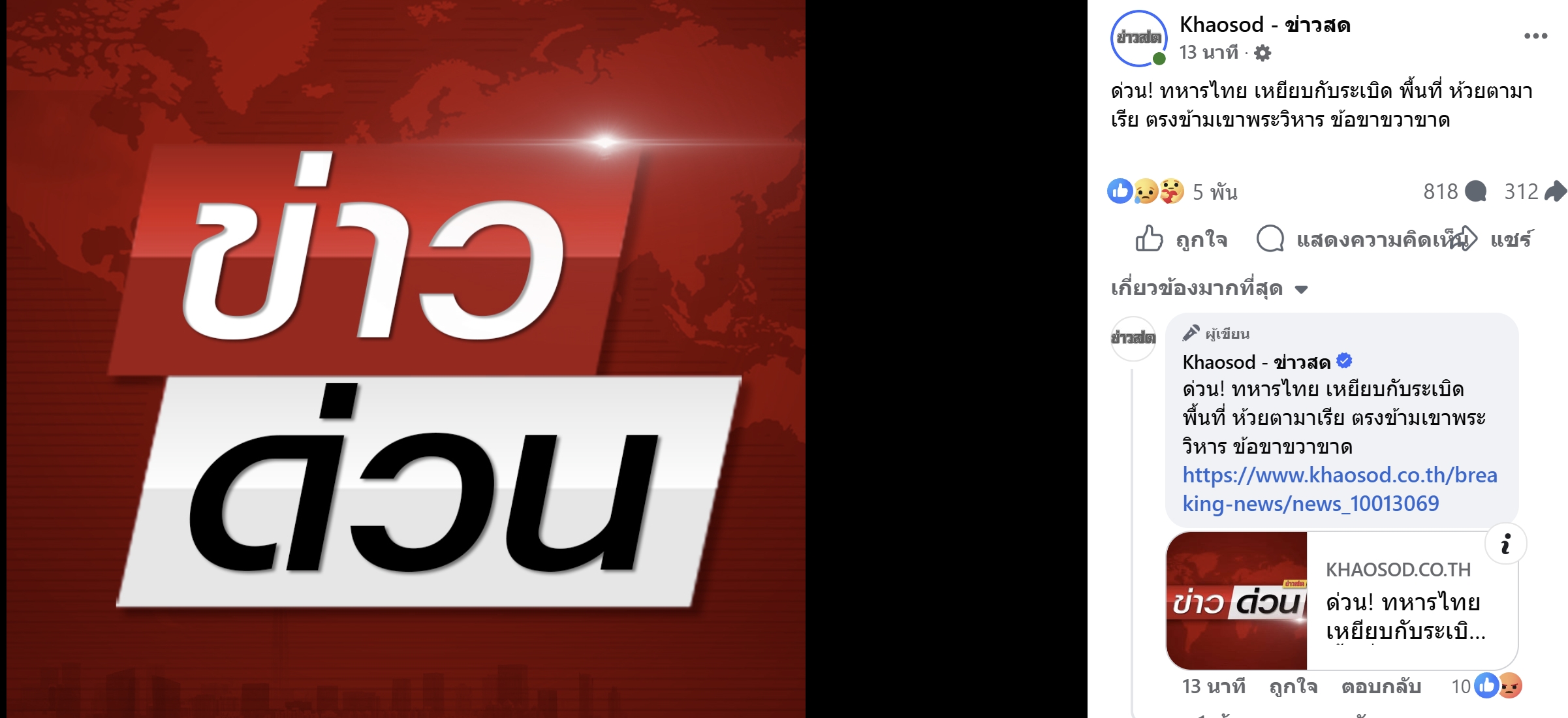 ด่วน! ทหารไทย เหยียบกับระเบิด พื้นที่ ห้วยตามาเรีย ตรงข้ามเขาพระวิหาร ใน พื้นที่กองทัพภาค 2 โดยได้รับบาดเจ็บข้อขาขวาขาด เร่งลำเลียงส่งโรงพยาบาล