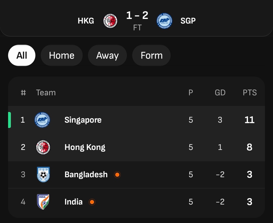 ** สิงคโปร์ แข่ง 5 นัด ชนะ 3 เสมอ 2 มี 11 คะแนน ผ่านเข้ารอบสุดท้าย เอเชี่ยนคัพ 2027 โดยไม่ต้องลุ้นผลนัดสุดท้าย เพราะ H2H ดีกว่าฮ่องกง ทีมคู่แข่ง