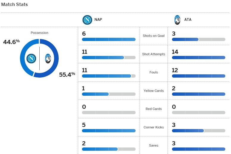 ดาวิด เนเรส เหมาคนเดียวสองประตู และอีกลูกจาก โนอา ลัง ซึ่งทั้งสามประตูของ นาโปลี เกิดขึ้นในครึ่งแรกทั้งหมด แม้ว่า จานลูก้า สคามัคก้า มาซัดตีไข่แตกให้ อตาลันต้า ในครึ่งหลังแต่ก็ไม่ทันการ เป็นลูกทีมของ อันโตนิโอ คอนเต้ ที่เอาชนะไปได้ 3-1 พร้อมทำคะแนนขึ้นไปนำจ่าฝูงสำเร็จ