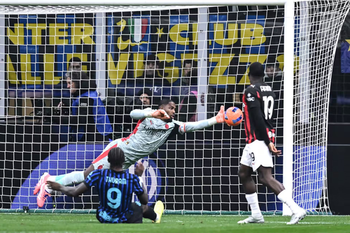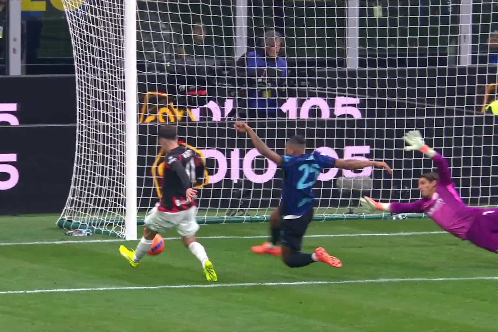 อินเตอร์ เปิดเข้าเขตโทษ ตูราม โขกตั้งให้ เลาตาโร่ วอลเลย์เน้นๆ เมญอง ปัดปลายมือแล้วบอลเด้งไปชนเสา มิลาน รอดหวุดหวิด