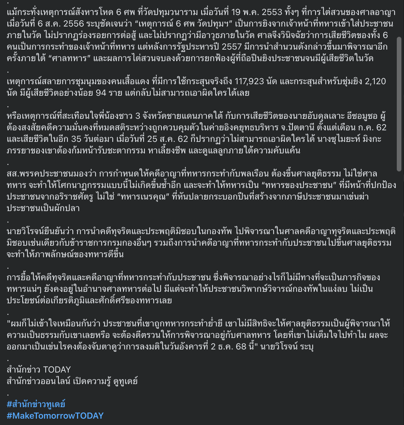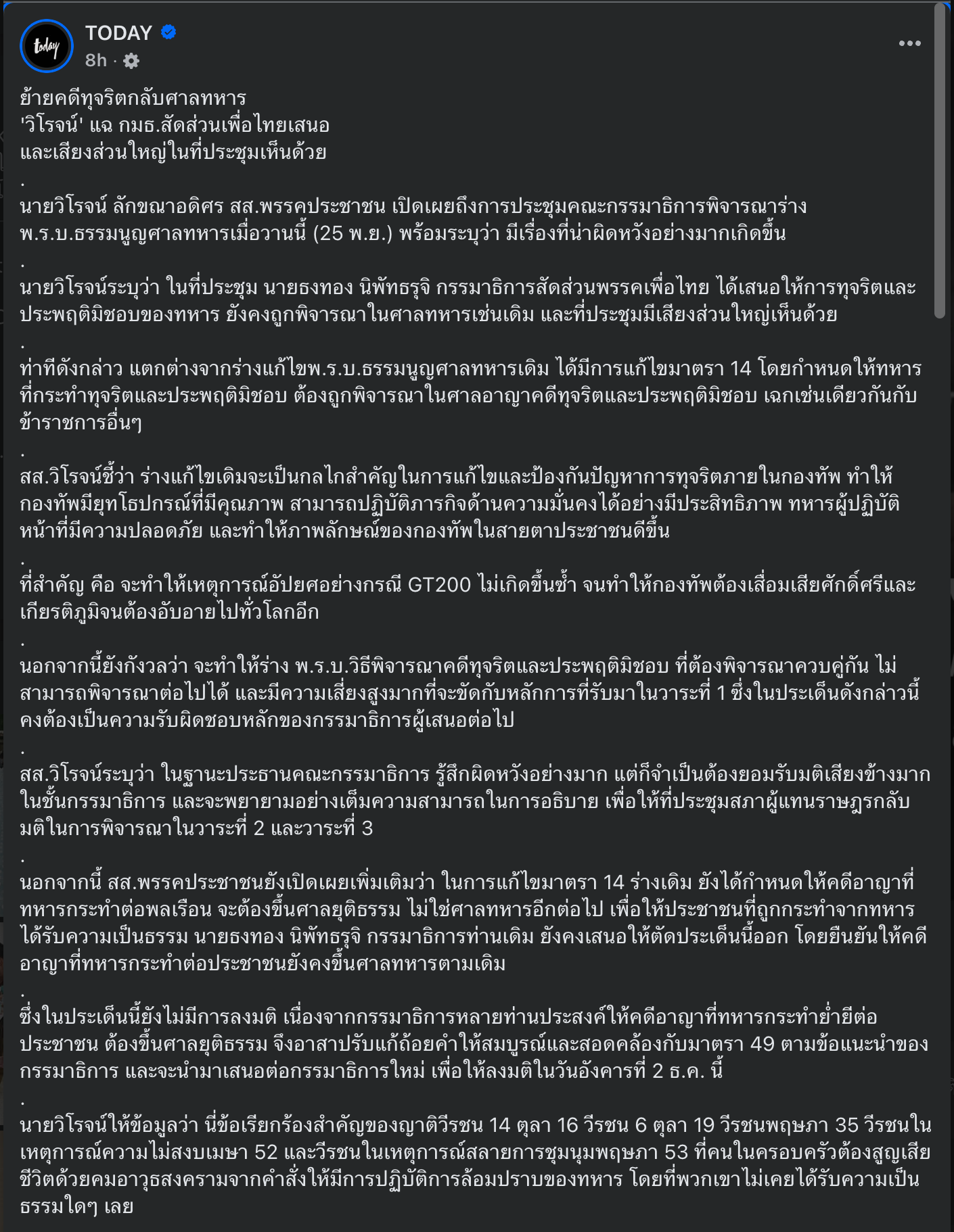 [RE: สส 'วิโรจน์' แฉ กมธ.สัดส่วนเพื่อไทยเสนอย้ายคดีทุจริตกลับศาลทหาร]