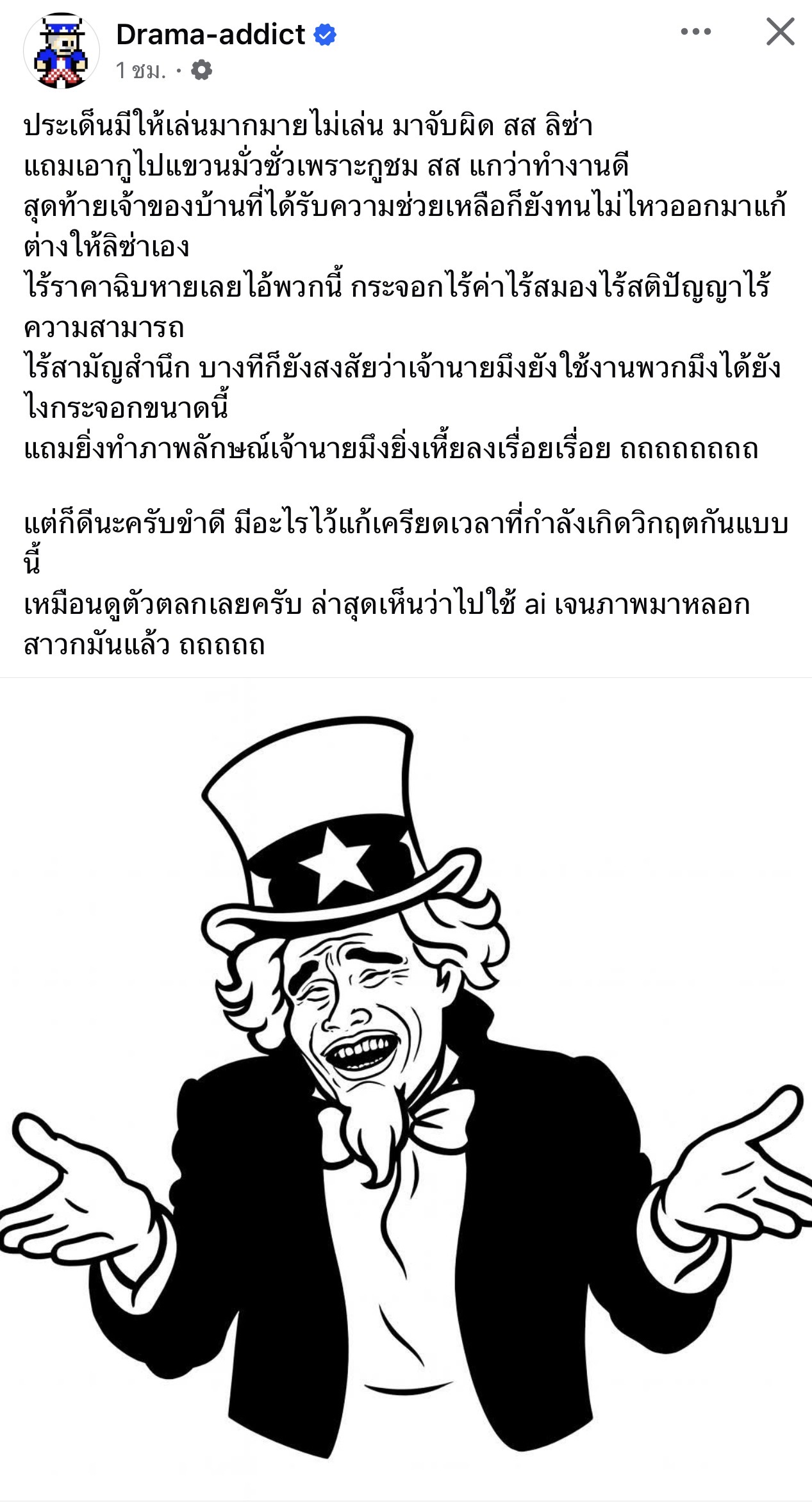 ละคือประเด็นมันมีเรื่องอื่นตั้งเยอะเสือกมาเล่นประเด็นโคตรเลอะเทอะ แถมมันยิ่งดูทุเรศไปอีก เค้าลงพื้นที่ไปช่วยก็ไปช่วยจริงๆด้วยนะเสือกเอาประเด็นโคตรไร้สาระมาไล่ดิสเครดิต แถมแม่งงับกันเป้นแถวๆเป็นทอดๆเลย แต่แก้ต่างไปก็ไม่ช่วยอะไรหรอกไอ่คนพวกนี้มันขอแค่ได้โจมตีดิสเครดิตก็พอใจละ