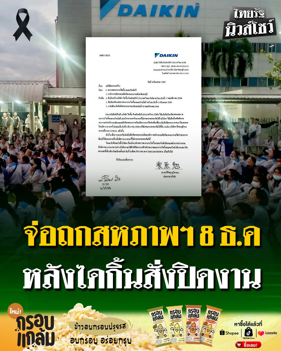 5 ธันวาคม 2568 ผู้สื่อข่าวรายงานสถานการณ์ข้อพิพาทแรงงาน ภายในบริษัท ไดกิ้น อินดัสทรีส์ (ประเทศไทย) จำกัด หลังเกิดกรณีบริษัทประกาศใช้มาตรการ "ปิดงานงดจ้าง" หรือ Lockout สืบเนื่องจากการเจรจาข้อเรียกร้องเรื่องโบนัสและสวัสดิการประจำปีระหว่างบริษัทกับสหภาพแรงงานไม่สามารถตกลงกันได้