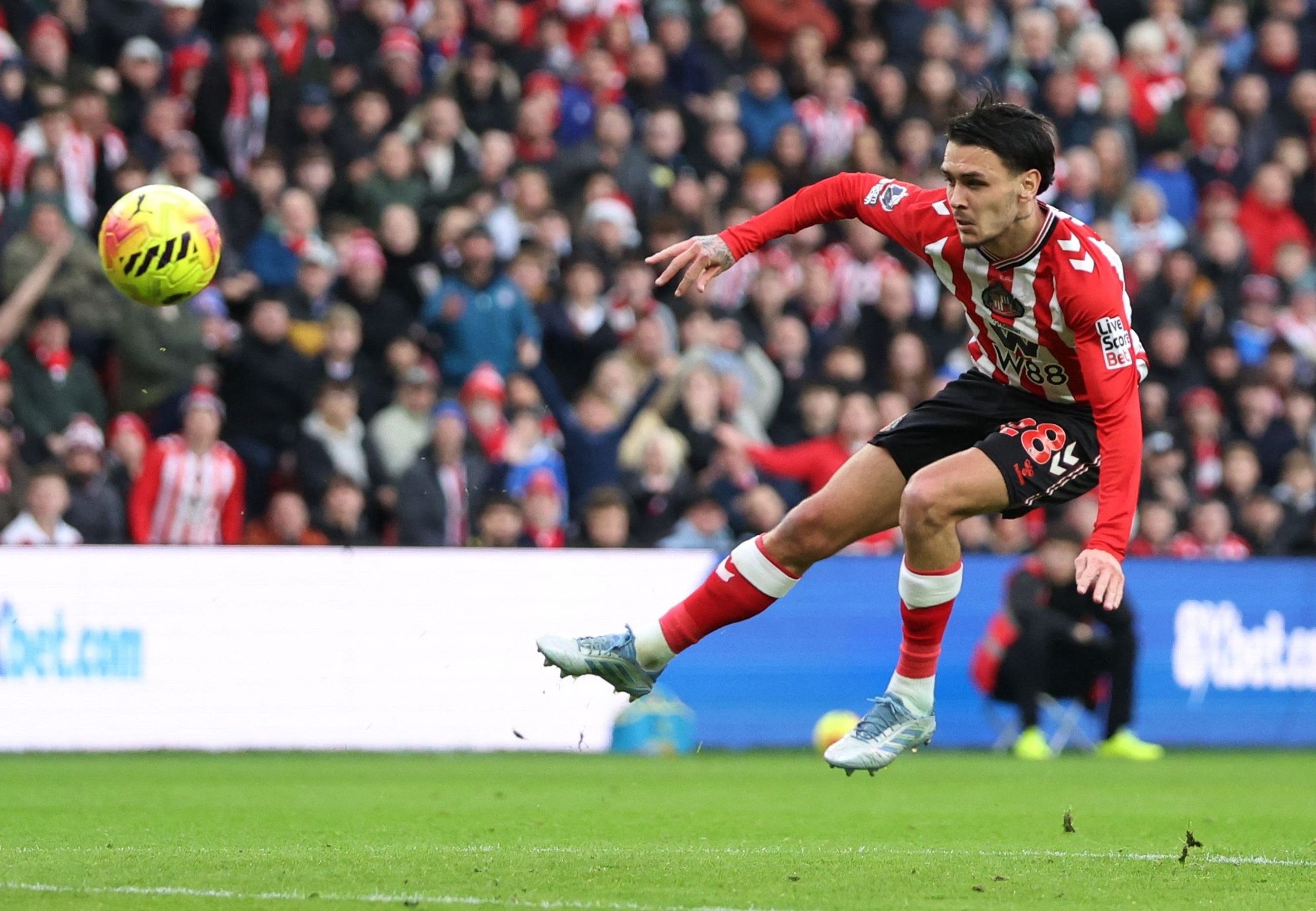 แล้วพอเจาะไม่เข้า ซันเดอร์แลนด์ ก็ต้องลองวิธีอื่นหลังจากลูกทุ่มไกลเข้าไปไม่ได้ผลแต่แถวสองยังเก็บได้จ่ายให้ ชาก้า ตัดสินใจยิงไกลลอยออหลัง