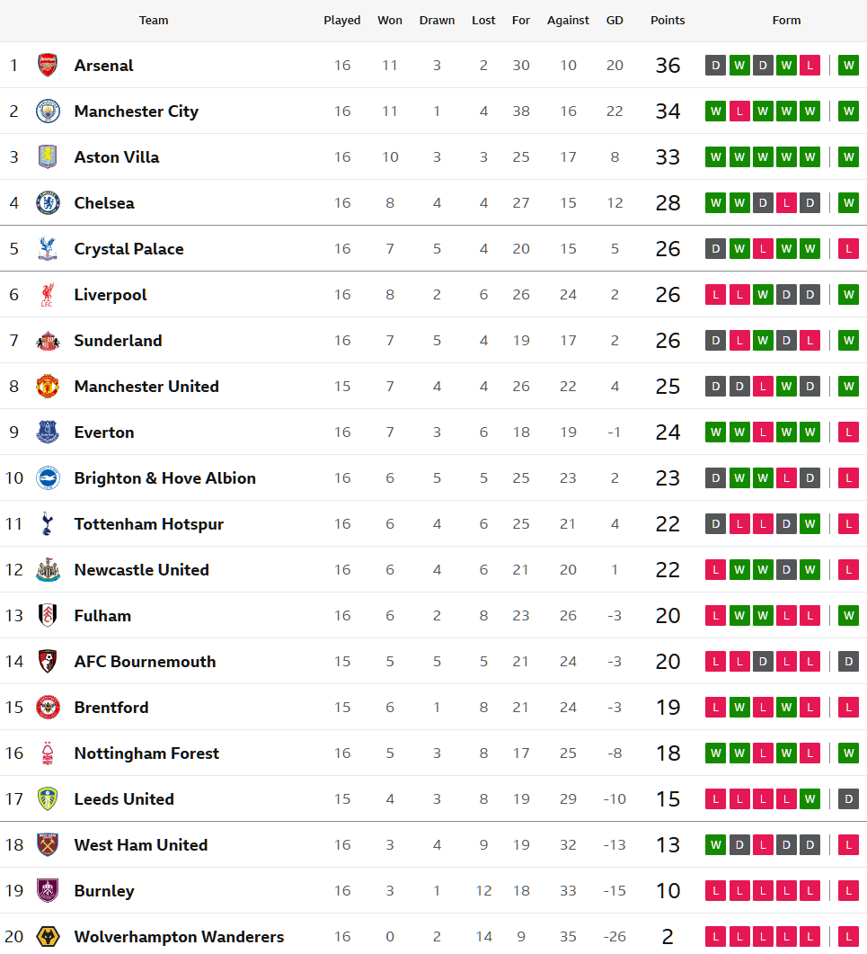 ขณะที่ ซันเดอร์แลนด์ ขยับขึ้นไปอยู่ในอันดับ 7 โดยมี 26 แต้ม