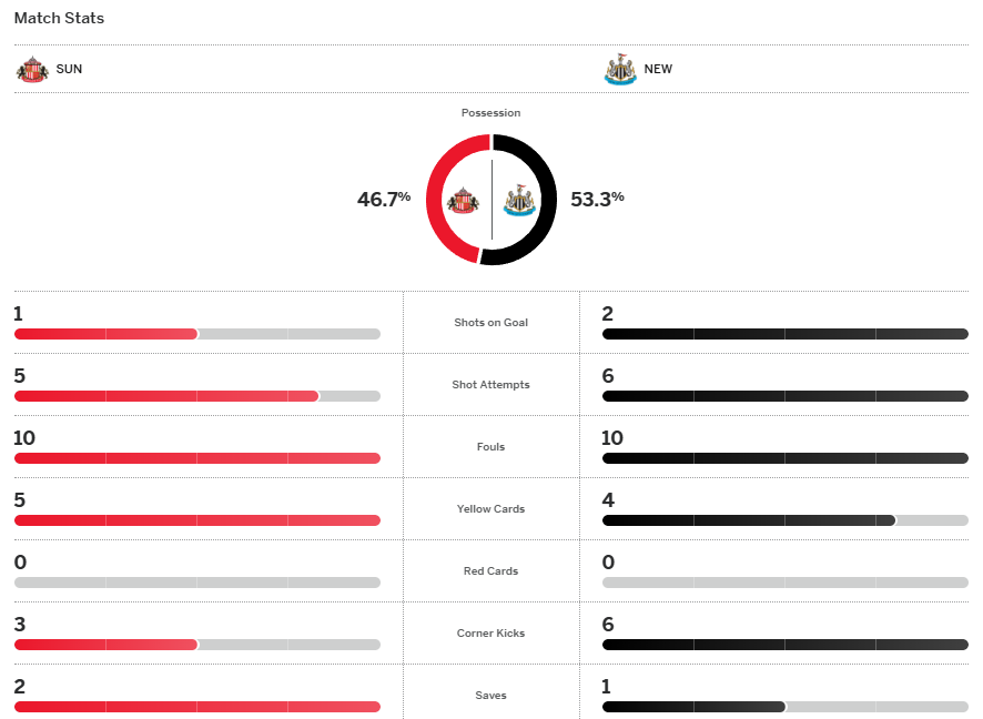 จบเกม นิวคาสเซิ่ล แพ้ให้กับ ซันเดอร์แลนด์ 1-0 เป็นความพ่ายแพ้หนแรกจาก 5 นัดหลังสุดในลีกทำให้พวกเขายังอยู่อันดับ 12 ของตาราง
