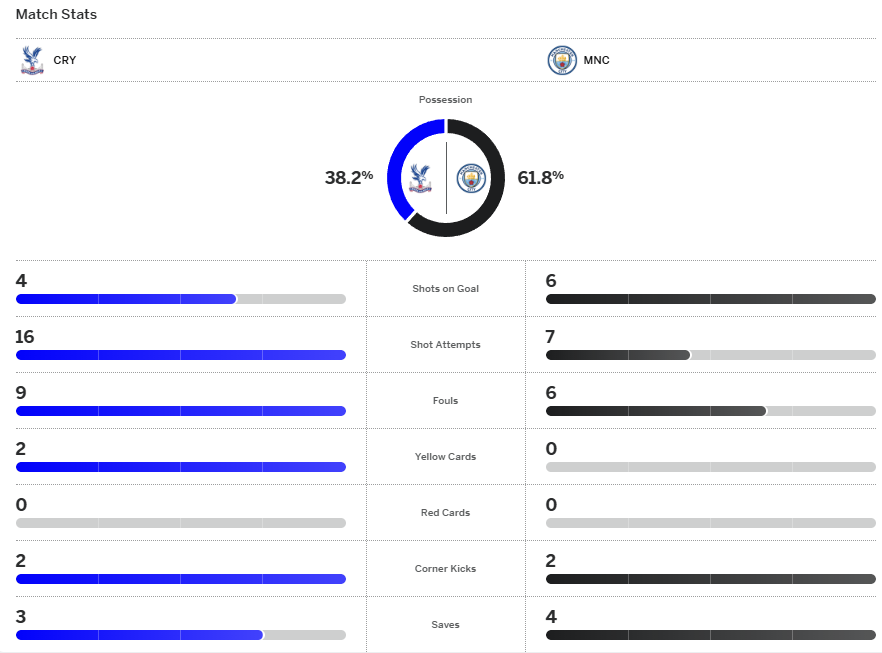 คริสตัล พาเลซ ทำเกมบุกได้ดีแต่ยิงไปชนเสาชนคานพลาดได้ประตู ขณะที่แมนเชสเตอร์ ซิตี้ บุกน้อยกว่าแต่มาคมจัดๆ เออร์ลิ่ง ฮาลันด์ โขกนำก่อน ฟิล โฟเด้น ส่องไกลอีกตุงแล้วฮาลันด์ ซัดจุดโทษปิดท้าย แมนเชสเตอร์ ซิตี้ บุกชนะขาดลอย 3-0 ตามไล่อาร์เซน่อลต่อไป