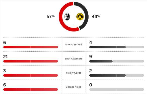 เรมี่ เบนเซไบนี่ ชาร์จฟรีคิกให้ โบรุสเซีย ดอร์ทมุนด์ นำก่อนครึ่งแรก แต่ต้นครึ่งหลัง โจ๊บ เบลลิ่งแฮม ฟาวล์ตัวสุดท้ายรับใบแดงจนเหลือสิบคน แล้วต้านไม่อยู่โดน ไฟร์บวร์ก ยิงคืน ทำได้แค่บุกเสมอ 1-1 พลาดโอกาสขึ้นรองจ่าฝูง บุนเดสลีก้า